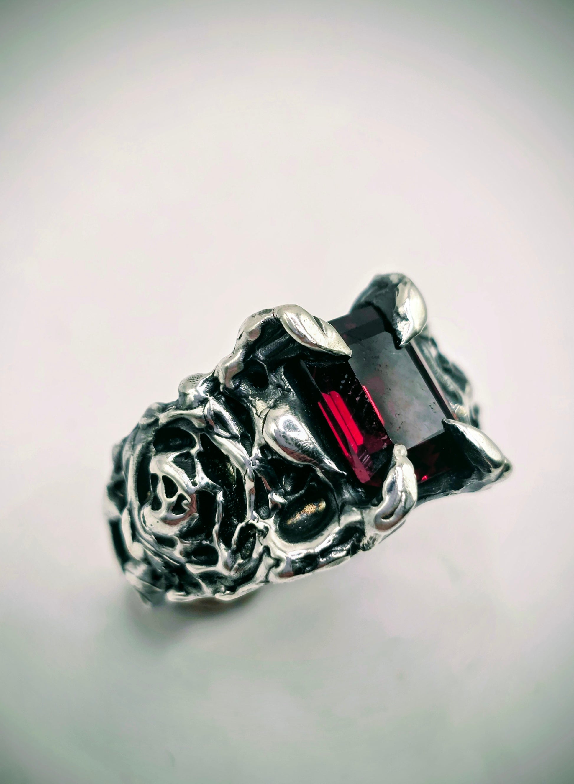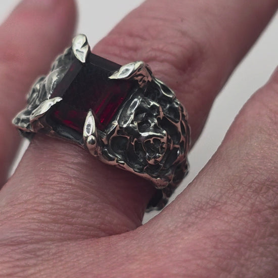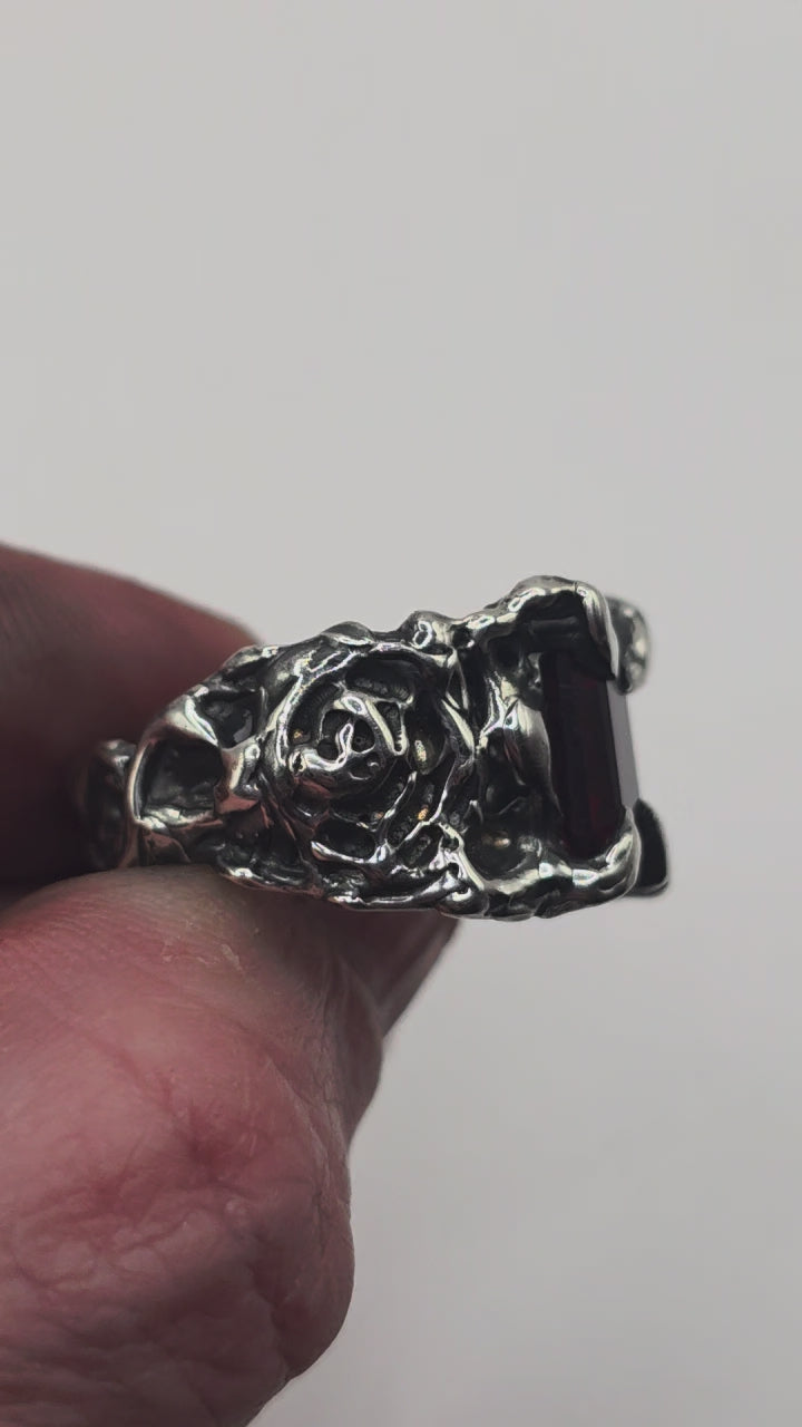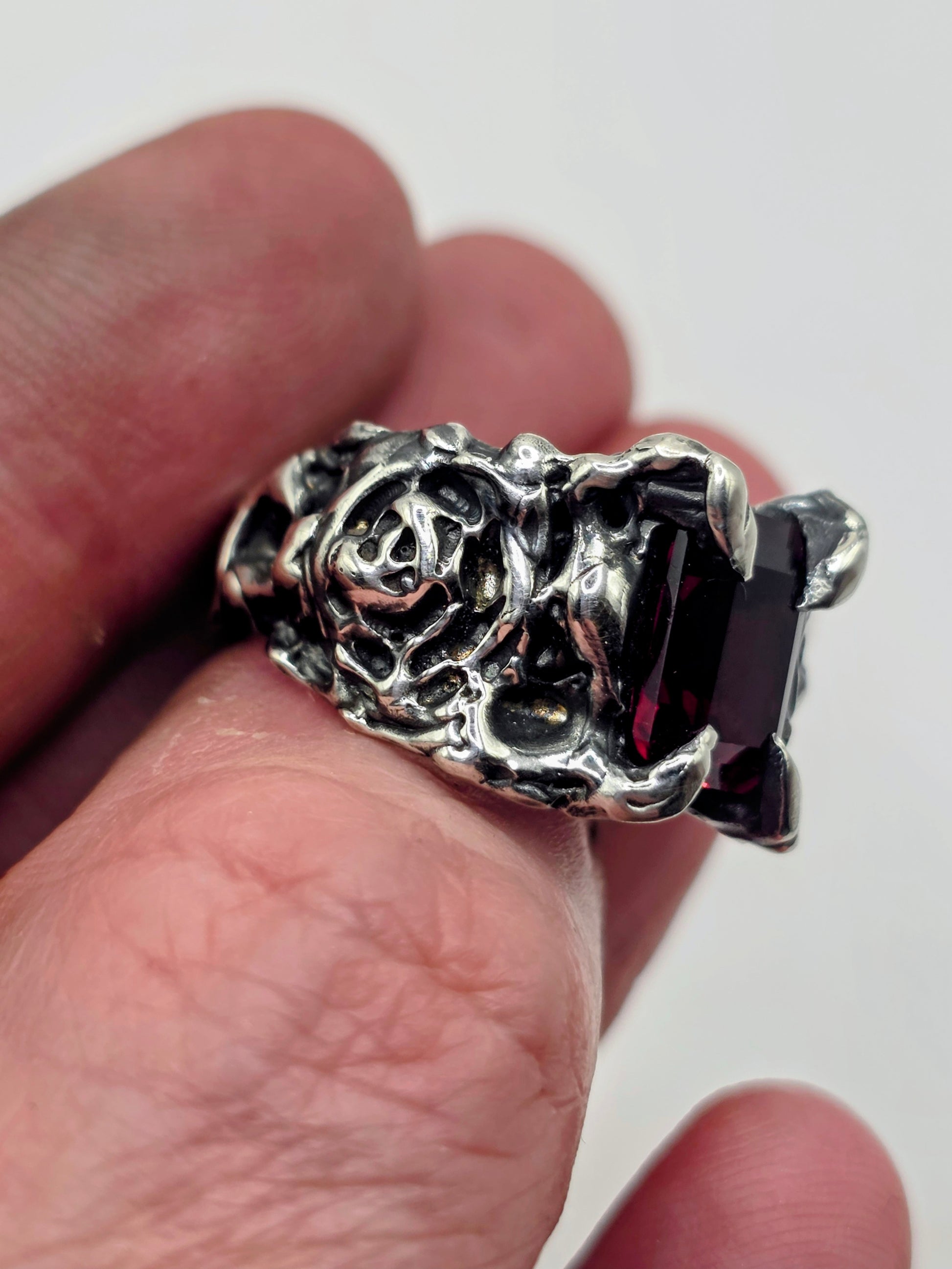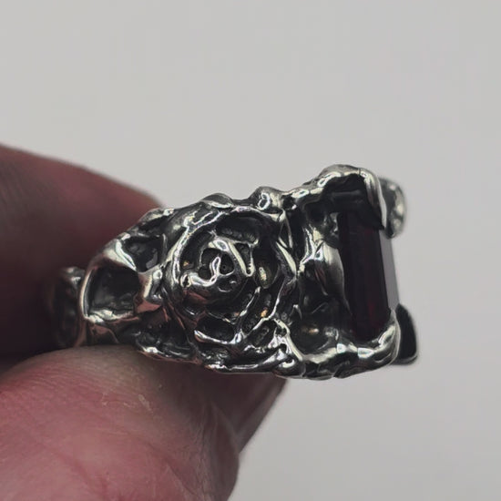 Clawed prongs hold a deep red garnet in place, framed by textured silver and carved rose detail through the band.