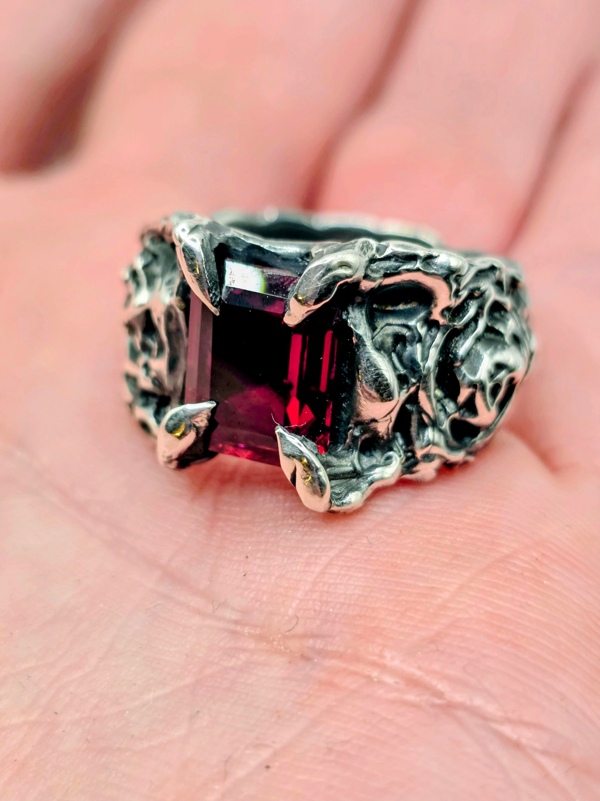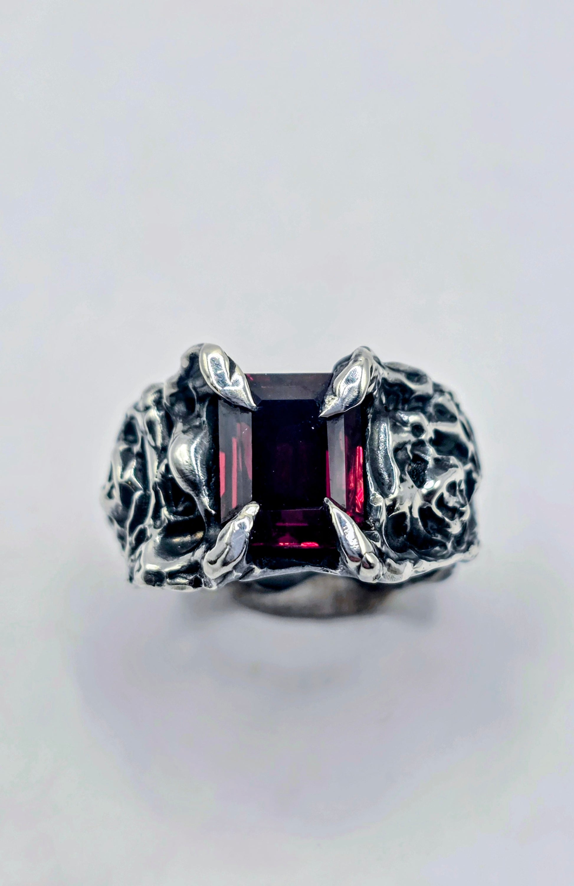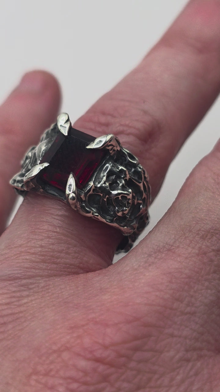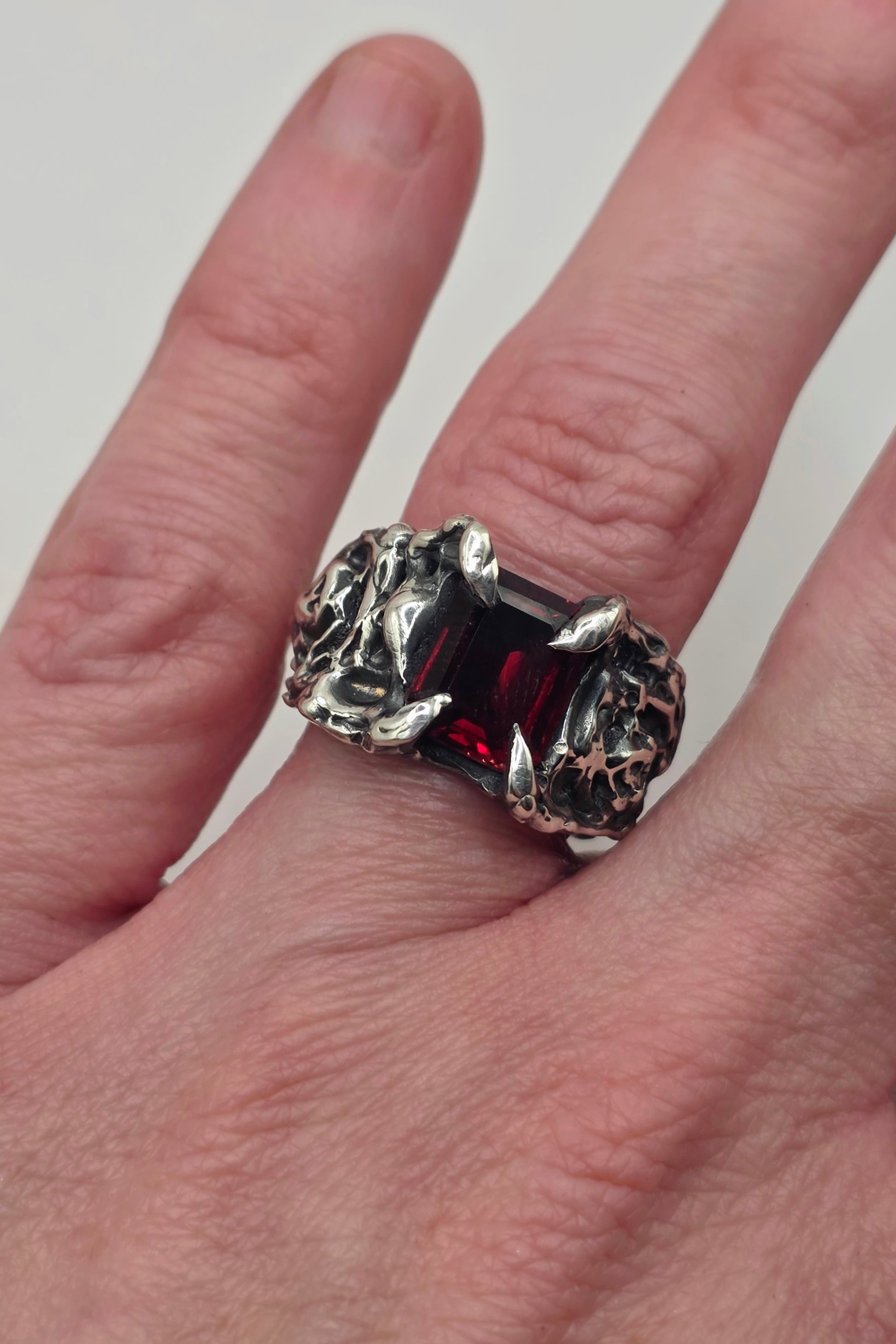 Clawed prongs hold a deep red garnet in place, framed by textured silver and carved rose detail through the band.